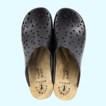 Підошва з поліуретану є гнучкою і має властивості амортизації та антиковзання, а анатомічна устілка включає супінатор, що допомагає розгрузити передню частину стопи і зменшити навантаження на суглоби та хребет. Верхній матеріал сабо та підкладка виготовлені з натуральної шкіри, а закритий носок з перфорацією дозволяє вашим ногам дихати.